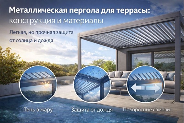 Данная статья носит информационный характер и посвящена разбору того, что представляет собой металлическая пергола, из каких материалов она изготавливается, как устроена её конструкция и какие задачи она способна решать на террасе или в открытом пространстве.